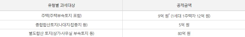 과세기준일(매년 6월 1일) 현재 국내에 소재한 재산세 과세대상인 주택 및 토지를 유형별로 구분하여 인별로 합산한 결과이고, 그 공시가격 합계액이 각 유형별로 공제금액을 초과하는 경우에는 그 초과분에 대하여 과세되는 세금입니다.
