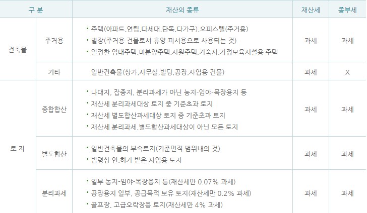주택(부속토지포함), 종합합산토지, 별도합사놑지로 구분하여 과세대상 판정이 됩니다.